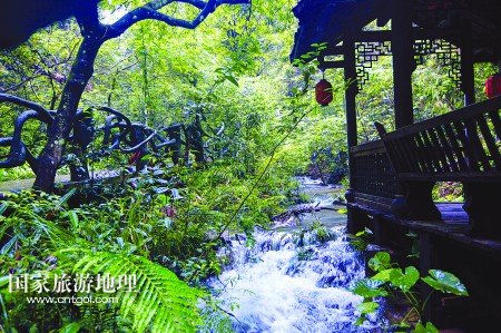 穿過客家小鎮(zhèn)古色古香的街道,卻走進(jìn)了一片清幽的圣地——圣人谷。圣人谷由盤龍寨和盤鳳寨相互盤踞而成,古藤老樹環(huán)繞中,陽光被遮擋得支離破碎,斑斑點(diǎn)點(diǎn)地灑落在雀躍的溪流上、濕潤的石徑中。這里是靜寂的,沒有絲毫凡間世俗;這里又是熱鬧的,蟲鳴鳥叫、泉水叮咚、古樹摩挲,各種大自然的聲響充斥在耳邊。時而,小路旁會有木質(zhì)小樓梯,把人引入一間草寮,在竹制的桌椅旁,傾聽著大自然的交響樂,生活的各種紛擾霎那間煙消云散。