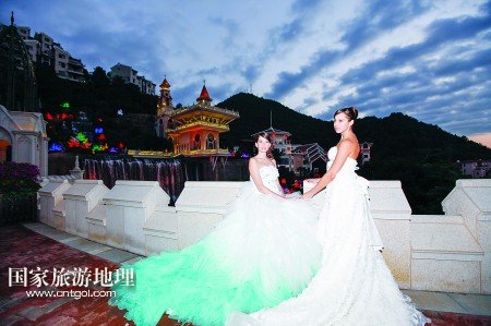 乘著電瓶車,從客天下廣場穿過雅致的圣山湖住宅區(qū),赫然出現(xiàn)在眼前的卻是大型婚禮殿堂,純歐式的建筑群隱匿在青山綠水中:乳白色的圓形屋頂、七彩斑斕的玻璃窗、富麗堂皇的大吊燈,見證了一對又一對新人走進(jìn)幸福的殿堂。在充滿異域風(fēng)情的幸福里大街,蘇格蘭風(fēng)笛表演、皇家馬車、中世紀(jì)格調(diào)的咖啡館,一幕又一幕,讓人恍若時空交錯。
