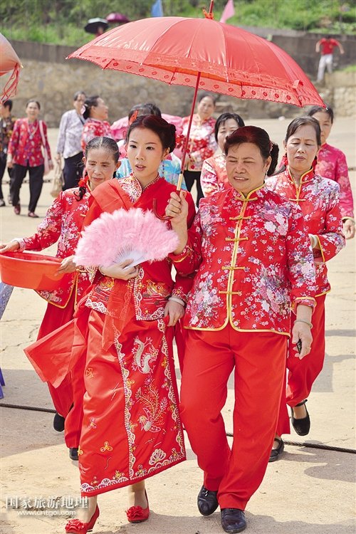 “五世其昌”的祝福對聯(lián),大紅的喜慶燈籠,插滿青草與鮮花的漁船顯得古樸而富有情調(diào)。而岸上的儀式也頗有講究:一張精心準(zhǔn)備的圓桌,擺著一盆四季橘,一只展翅欲飛、口銜“金幣”的“鳳凰雞”,寓意飛黃騰達。一對紅燭、算盤、鏡子、糯米飯等物品,均取吉祥如意之意。迎娶新娘的時辰未到,新娘的兩位兄嫂幫她梳妝打扮,描眉盤發(fā),給發(fā)髻插上珠玉釵,換上喜氣的紅綢裙,一番梳妝打扮之后,新娘變得美艷動人。裝扮完畢,新娘邀請自家姐妹及親戚“擺歌堂”,感激父母養(yǎng)育之恩,傾訴依依惜別之情。