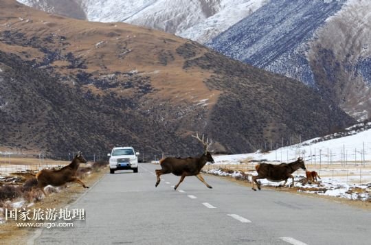 西藏工布江達(dá)縣境內(nèi) 白唇鹿群過公路(圖)