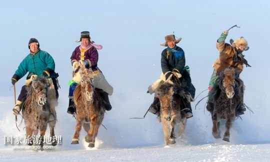 牧民在內(nèi)蒙古呼倫貝爾市新巴爾虎左旗的冬季賽馬會上策馬揚鞭(2011年1月1日攝)。