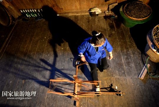 5月14日,高友村村民楊華梅在家里用紡紗機(jī)織布。