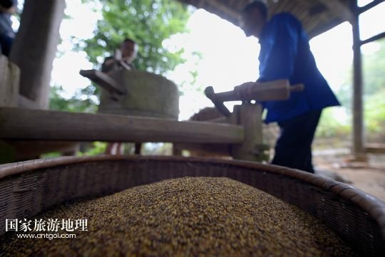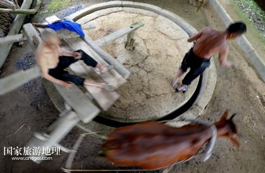 6月21日,在湖北省宣恩縣箭竹坪村的榨油房里,“打榨佬”們用牛拉石碾子將菜籽碾細(xì)。