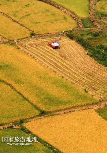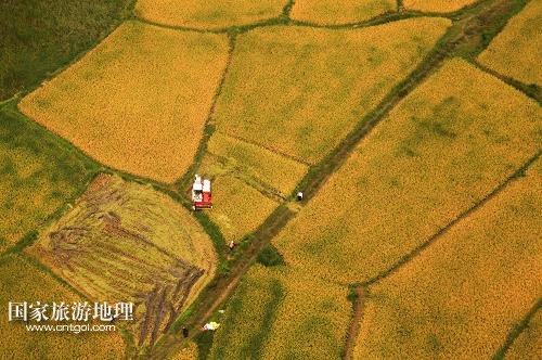 國家旅游地理 江蘇淮安9月27日訊 這是9月26日航拍的江蘇省淮安市盱眙縣鮑集鎮(zhèn)稻田收獲圖景。近期,江蘇省各地的水稻產(chǎn)區(qū)陸續(xù)開鐮收割。收割機踏著大地的指紋收獲金黃的稻谷,繪就一幅幅美麗的豐收圖畫。新華社發(fā)(周海軍 攝)