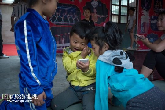 5歲孩子欒豪豪(中)和自己6歲的姐姐欒星星(右)在訓練間隙玩手機游戲(5月26日攝)。