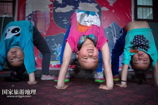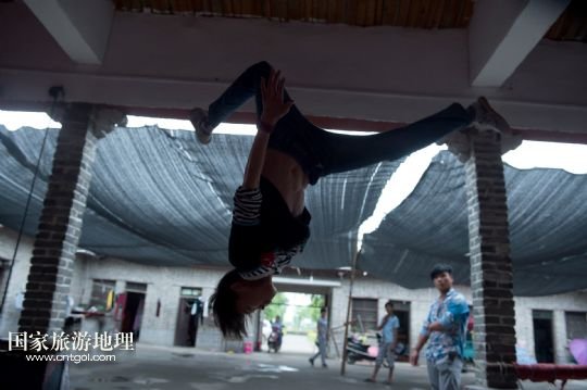 國家旅游地理 安徽阜陽5月31日訊 安徽省潁上縣三王村鄉(xiāng)村雜技學校成立于2007年。每年都有百余名農村孩子來到這里學習雜技。