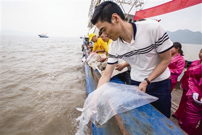 漁民在檀頭山海域放生黃魚(yú)苗和海龜。