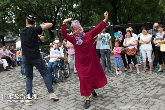 7月18日,穆斯林群眾在北京牛街的路邊跳舞。新華社記者 吳凱翔 攝