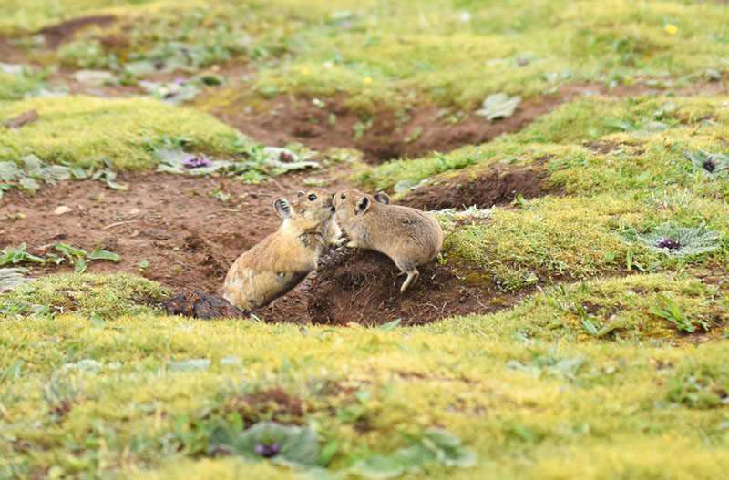 7月6日,兩只高原鼠兔在西藏思金拉錯(cuò)湖邊嬉戲。